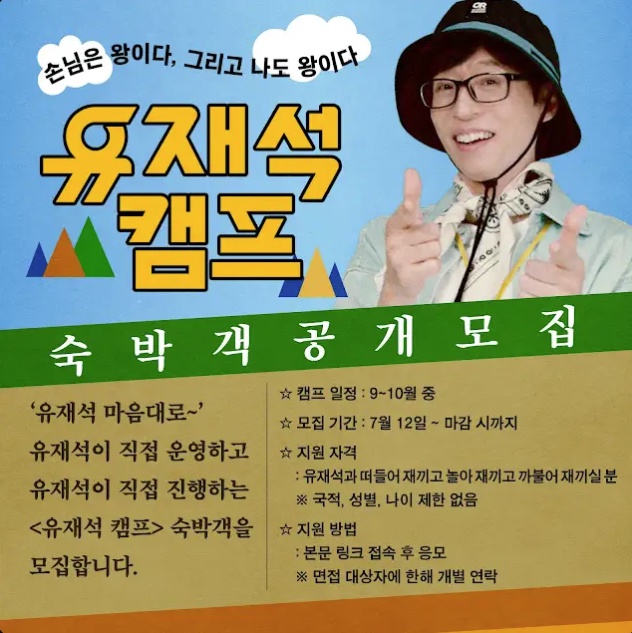 2025년 여름 가장 핫한 예능이 될 유재석 캠프! 평생 기억에 남을 특별한 경험을 원한다면 지금 바로 신청 준비해 보세요. 유느님과 함께하는 힐링 캠핑, 정말 상상만 해도 설레지 않나요?
